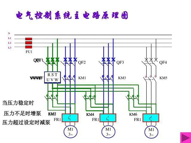 下行過程:當(dāng)系統(tǒng)壓力偏高,變頻器運(yùn)行在18HZ左右(18HZ以下泵的效率很低,經(jīng)驗(yàn)值)時,PLC程序判斷運(yùn)行在工頻狀態(tài)的泵累計(jì)運(yùn)行時間(若只有一臺泵不作判斷),運(yùn)行時間較多的泵延時先行撤出,在撤出的瞬間,PLC控制變頻器運(yùn)行頻率在50HZ,要不系統(tǒng)沖擊過大,容易有水垂現(xiàn)象,延時一會兒后,再把 PID運(yùn)算輸出投入即可;以此類推。注意:下行過程中,到之后一臺大泵運(yùn)行時,頻率在18HZ左右,系統(tǒng)壓力仍然偏高時,則把1#小泵切換到變頻運(yùn)行。這種情況在夜間可能發(fā)生,當(dāng)供水管網(wǎng)很大時,也許沒有這個可能性。